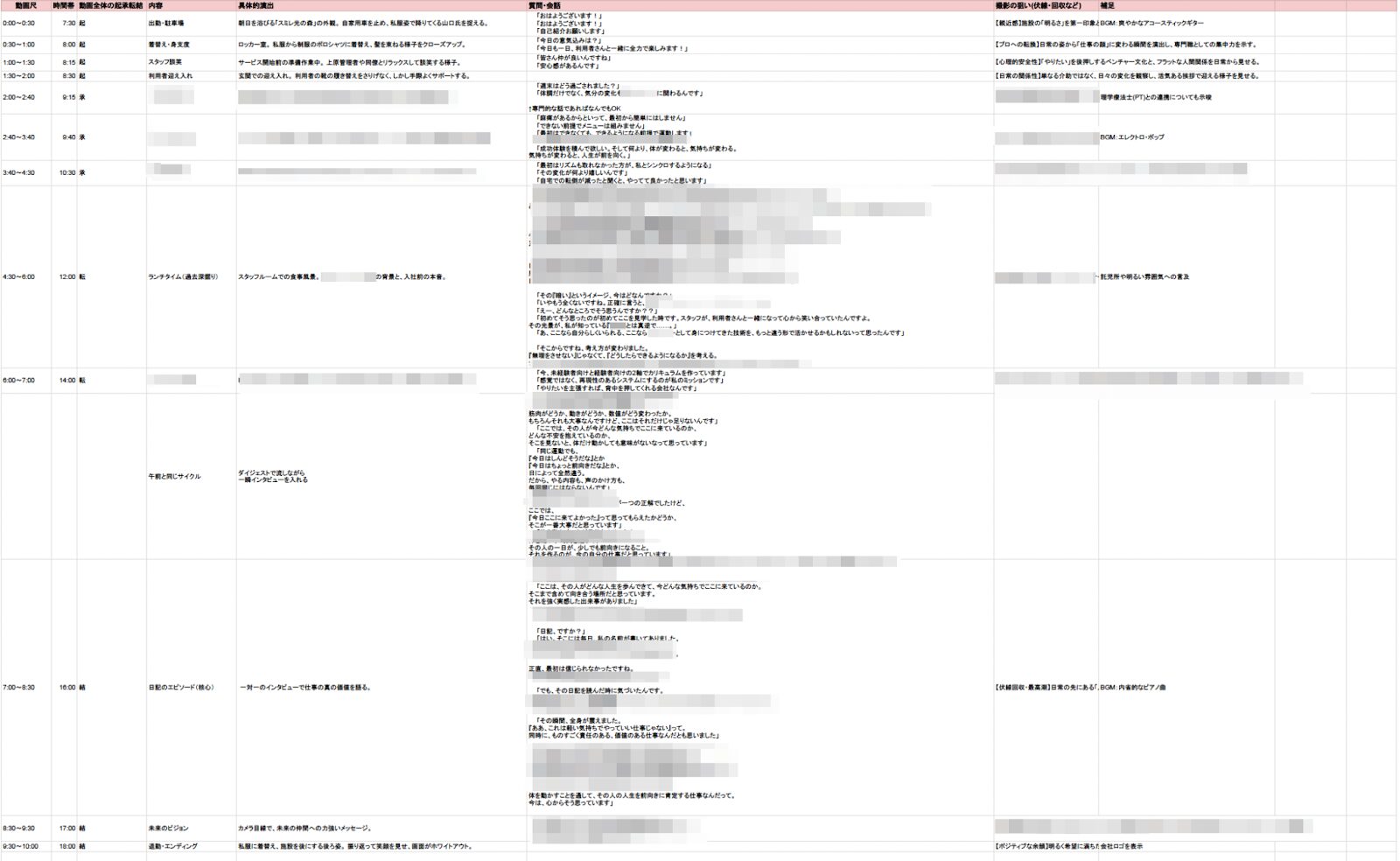 これらを決めておくと、密着当日は動画の完成形をイメージしながら撮影できます。ただカメラで1日を追い続けるだけでは視聴者に冗長な印象を与えてしまうため、あらかじめ香盤表で細部の演出まで描き、離脱されない工夫を凝らしましょう。