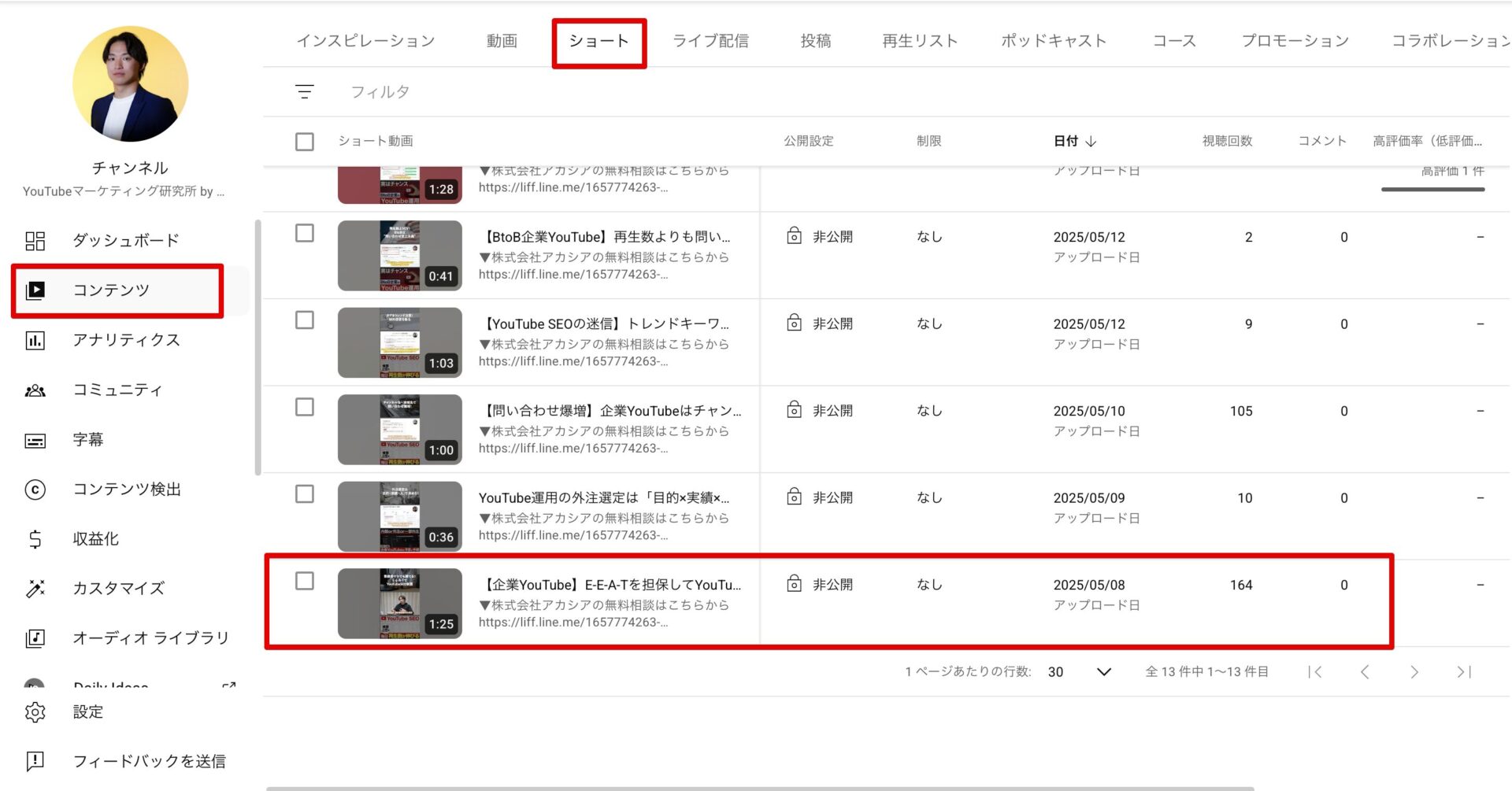 - 左にあるメニューのコンテンツから関連動画を設置したいショート動画を選択