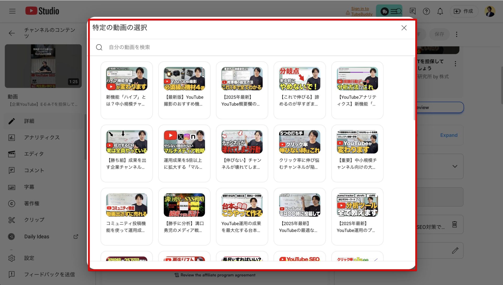 4.特定の動画の選択の画面が開いたら、関連動画に設置したい動画を選択